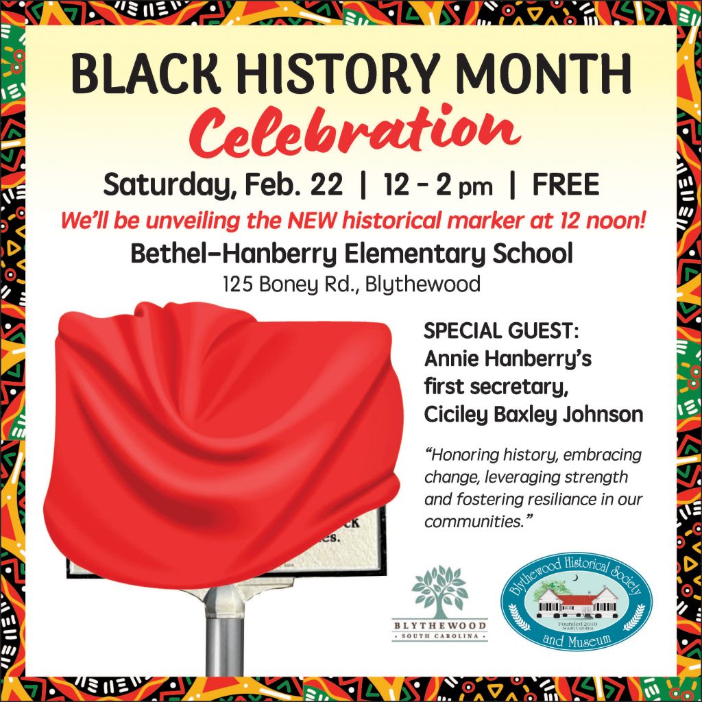 BLYTHEWOOD – The Blythewood Historical Society and Museum will host its annual Black History Month Celebration Saturday, Feb. 22, from 12 – 2 p.m., at the Bethel-Hanberry Elementary School. The event will feature the unveiling of a new historical marker at the school.