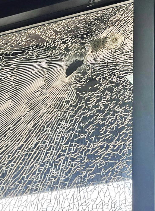The following morning, The Voice photographed a bullet hole in a front window of the Exxon Sharpe Shoppe convenience store.