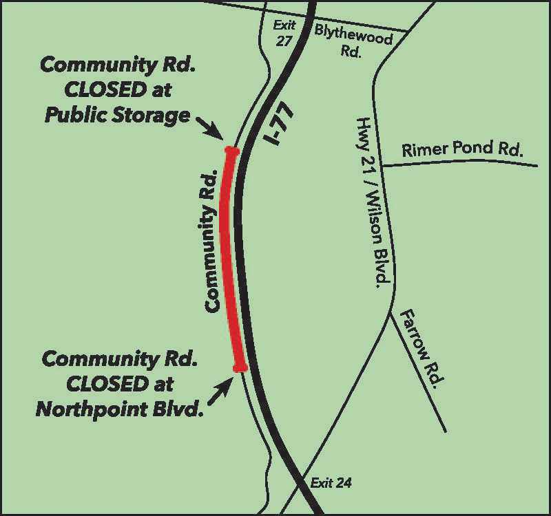 Changeable message boards have been deployed along Community Road alerting motorists of the upcoming detour schedule. Signs will be installed along the detour route to provide directions on how motorists can navigate to the north or south end of Community Road.