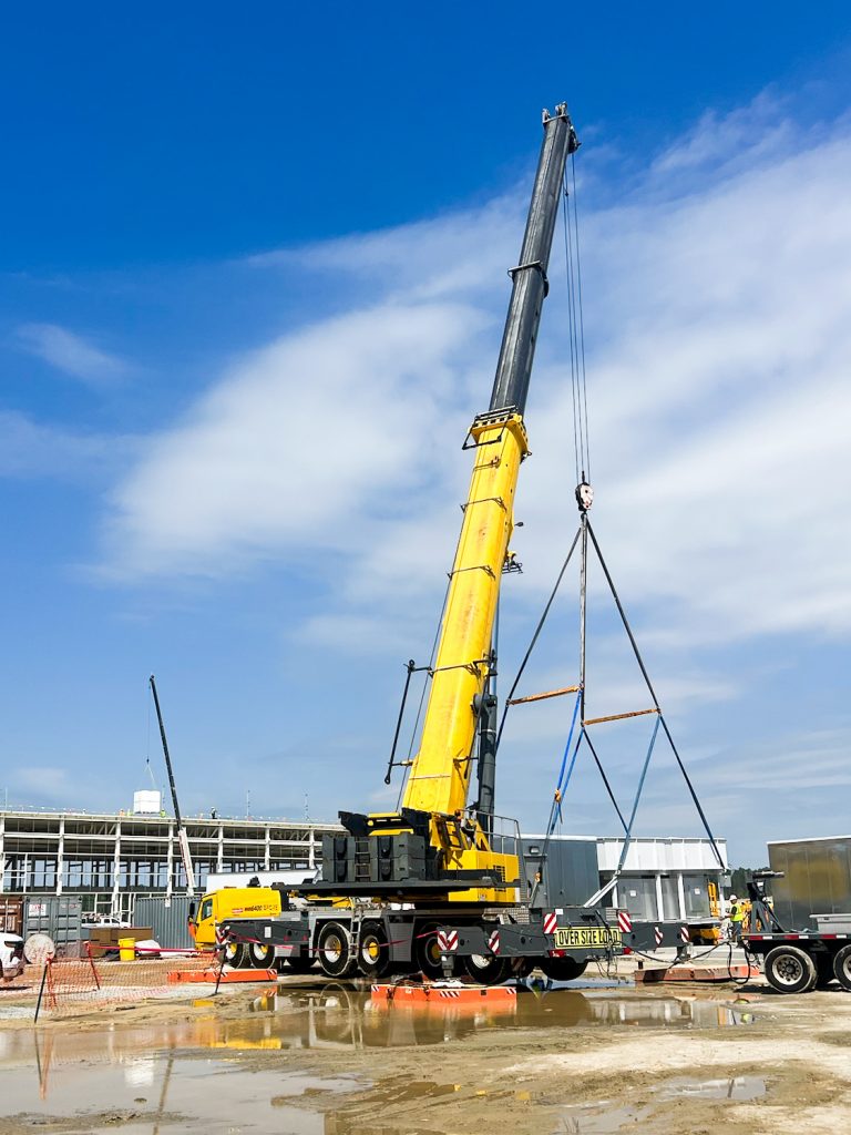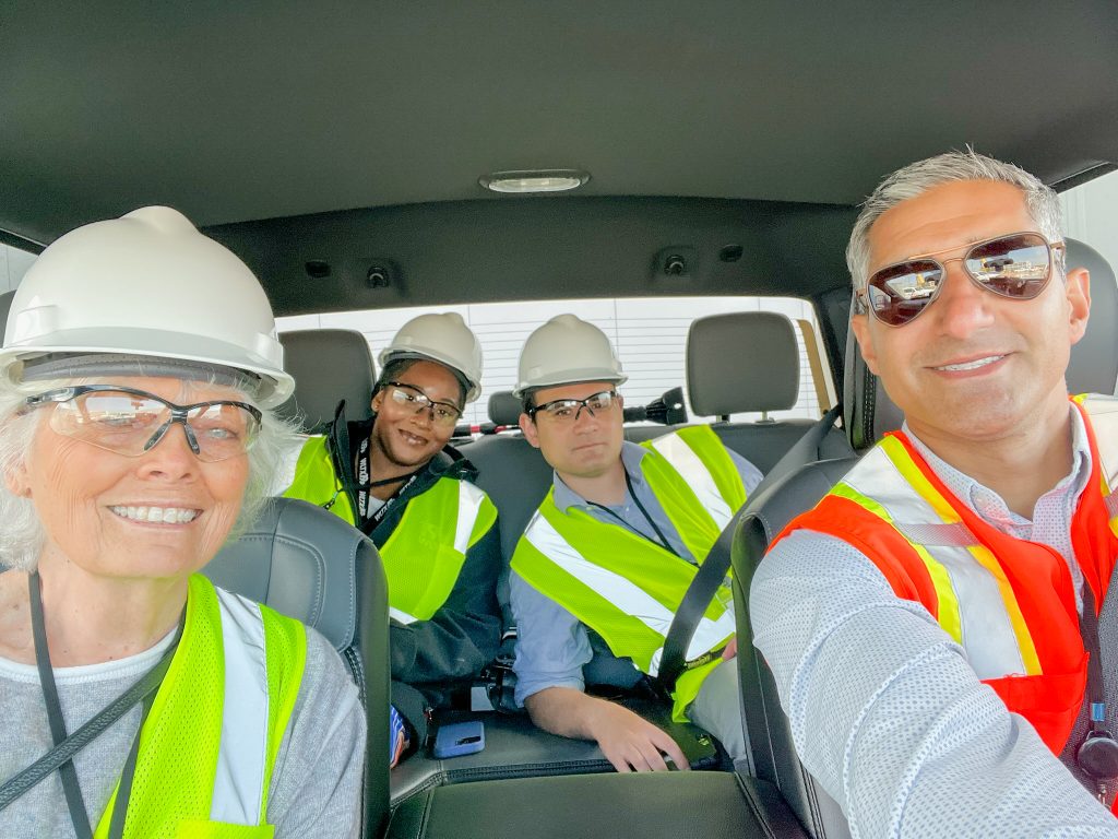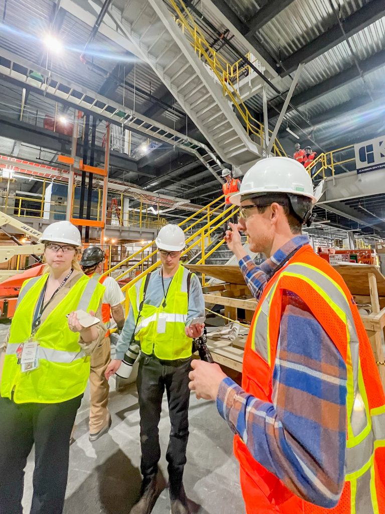 First stop on the tour was the largest of the several buildings on site. It’s the 1.3 million-square-foot assembly building where Keogh says everything comes together – where the seats, roof, and dashboard are all installed after being delivered by suppliers, many of which will be located on the grounds. The assembly building will house logistics, assembly robotics and a finishing area. The perimeter of the massive building is 6,600 square feet – equal to 22 football fields in a straight line. The building is currently a steel framework where crews are grounding the structural columns, digging pits and trenches, and will soon erect a roof.