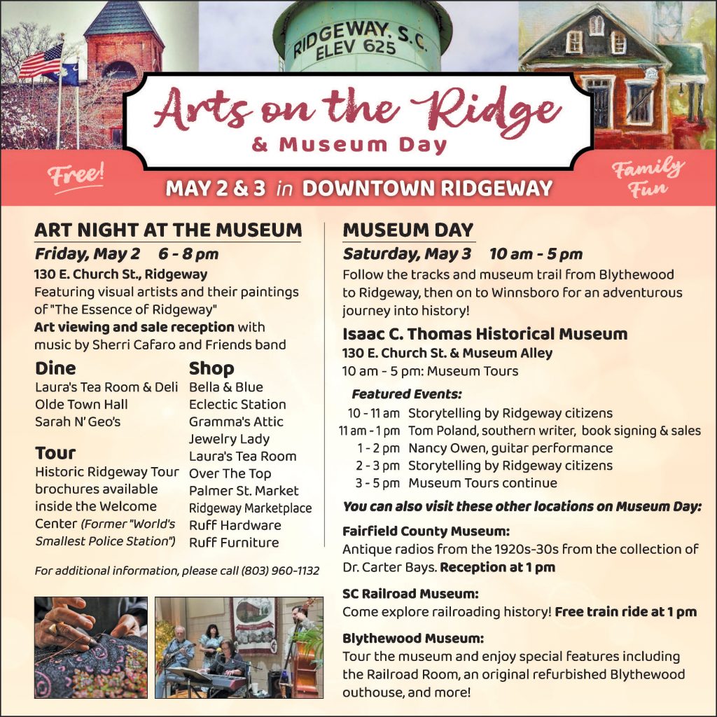 Arts on the Ridge will include tours of the town throughout the day, shopping at Ridgeway’s great shops, dining at the town’s several great eateries, and Art Night at the town’s new Isaac C. Thomas Historical Museum from 6-8 p.m. Friday evening, May 2. The museum is located at 130 E. Church Street and Museum Alley.