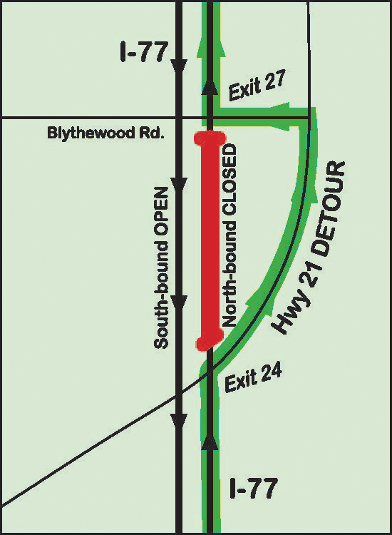 As part of these closures, a signed detour route will be put in place. Drivers will take Exit 24 and turn right on to Wilson Boulevard (US 21) and then turn left on to Blythewood Road where they will re-enter I-77 Northbound.
