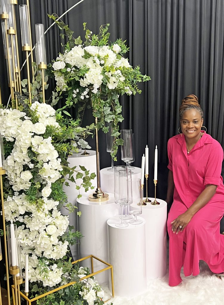 Walking into Kim’s event showroom is a glamorous experience with a celebration vibe. Elegant display tables stationed around the room glisten with gold, silver and glass appointments against a floor to ceiling backdrop of black fabric gathered across one wall.