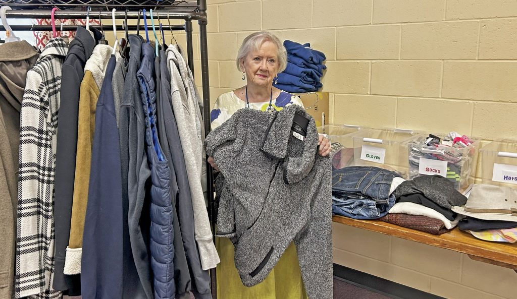In the Parish Hall of St. John’s, a coat rack is filled with coats and jackets of all styles and sizes, along with a table full of sweaters, scarves, gloves and socks.