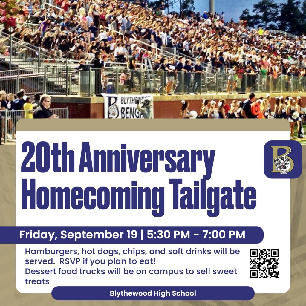 In celebration of its 20th Anniversary, Blythewood High School will host a Homecoming Tailgate on Friday, Sept. 19 from 5:30 – 7 p.m., and all are welcome.