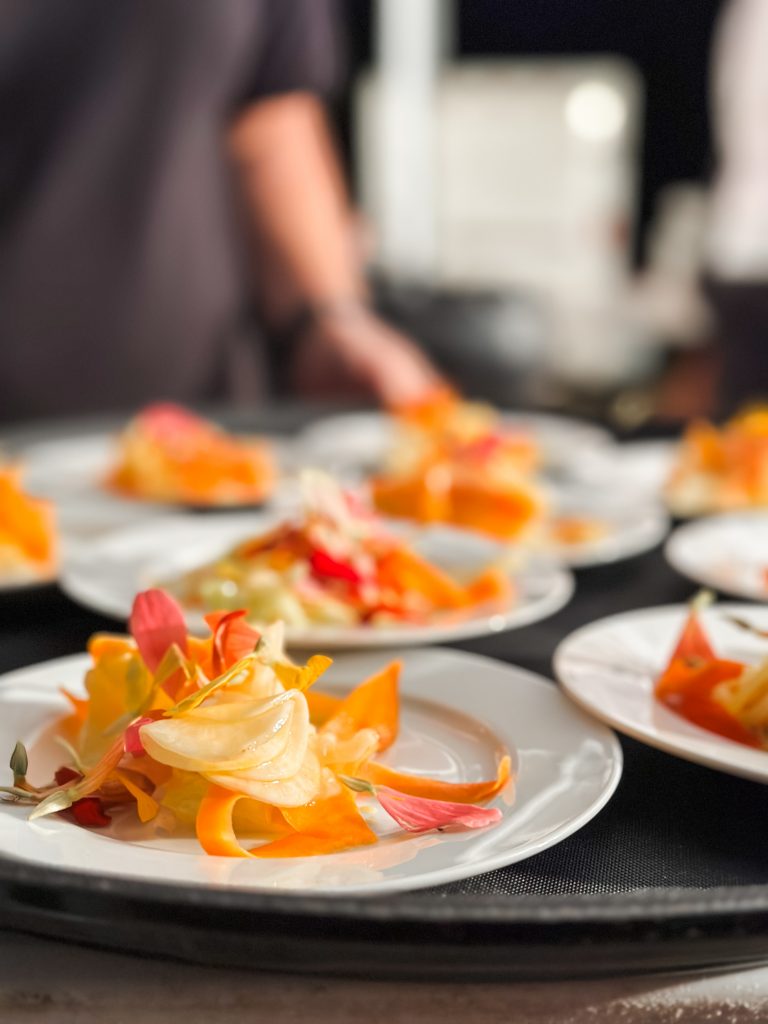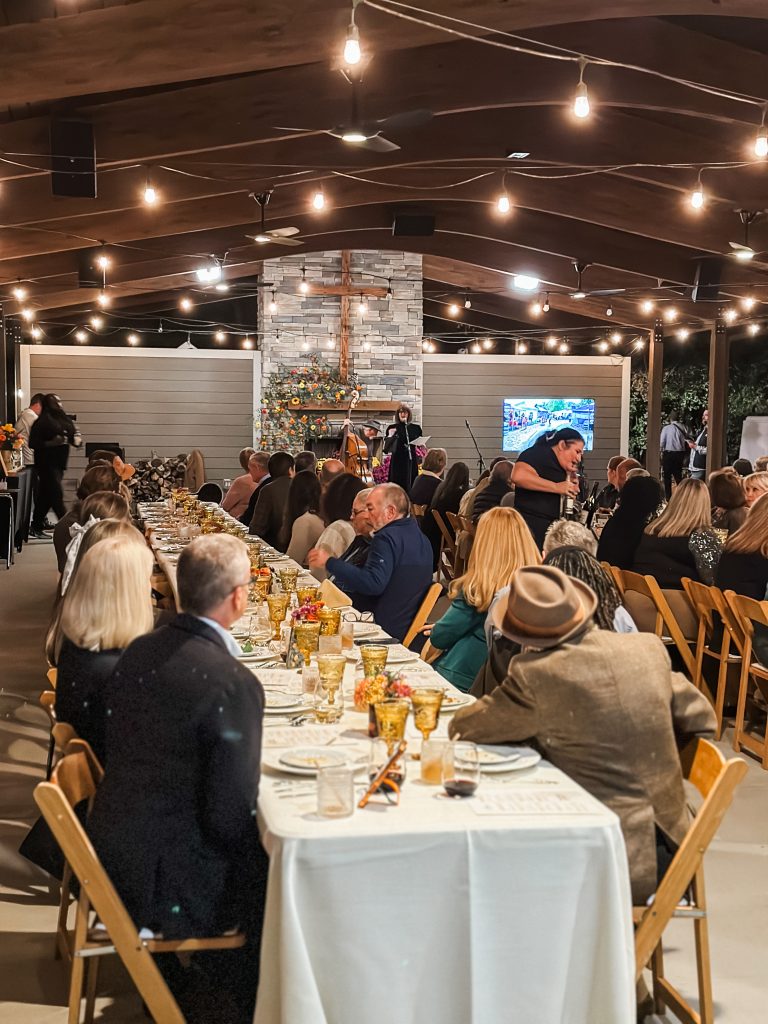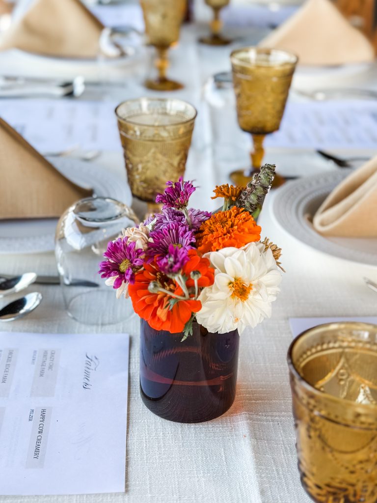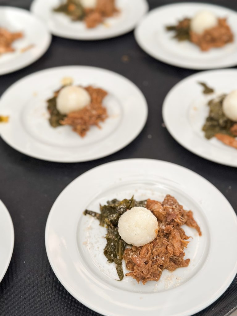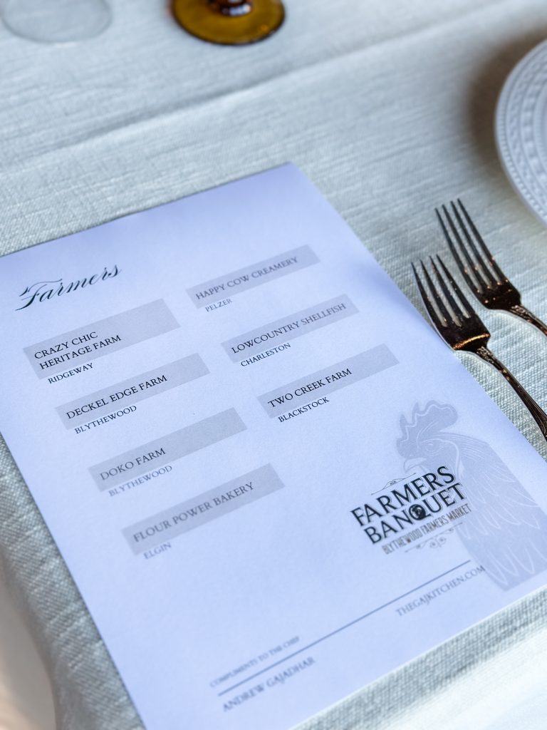 Ninety attendees, including town council members and candidates, regular shoppers, vendors, and families, enjoyed a signature cocktail, then live music from The Millhands bluegrass band. The evening featured a video celebrating the community’s local farmers. A nine course meal was prepared by chef Andrew Gajadhar, and served by high school volunteers from both Blythewood and Westwood High Schools.