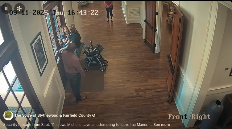 The incident unfolded in an hour-plus surveillance video that shows Michelle Layman arriving at the Manor, pushing a baby stroller and carrying an envelope in her hand. She later told The Voice that she was delivering a check to the Manor for her husband, Fred Layman, the Manor’s Director, who was on leave from his job at the time for cancer treatment.