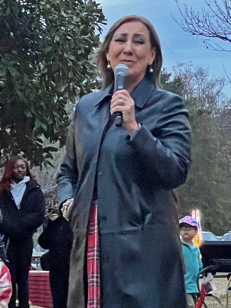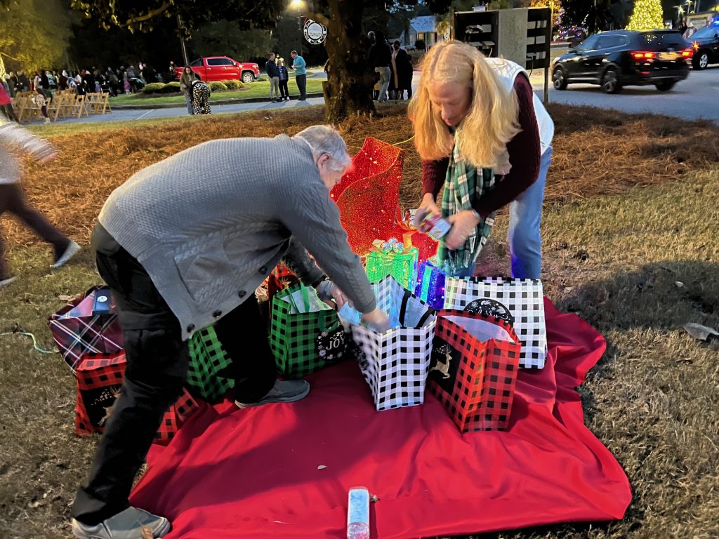 Following the lighting of the tree, there was hot chocolate, apple cider, and cookies. Newly elected councilmember Trish Hovis and her husband Roger, below center, collected food for CAB.