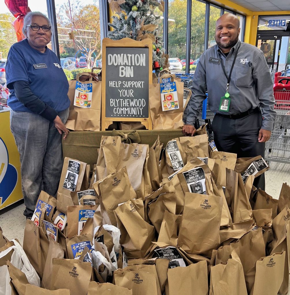 BLYTHEWOOD – KJ’s Manager Kevin Portee, right, grocery clerk Eunice Loric stand next to a pile of bags of canned goods that members of the community have purchased and gifted to CAB (Christian Assistance Bridge).