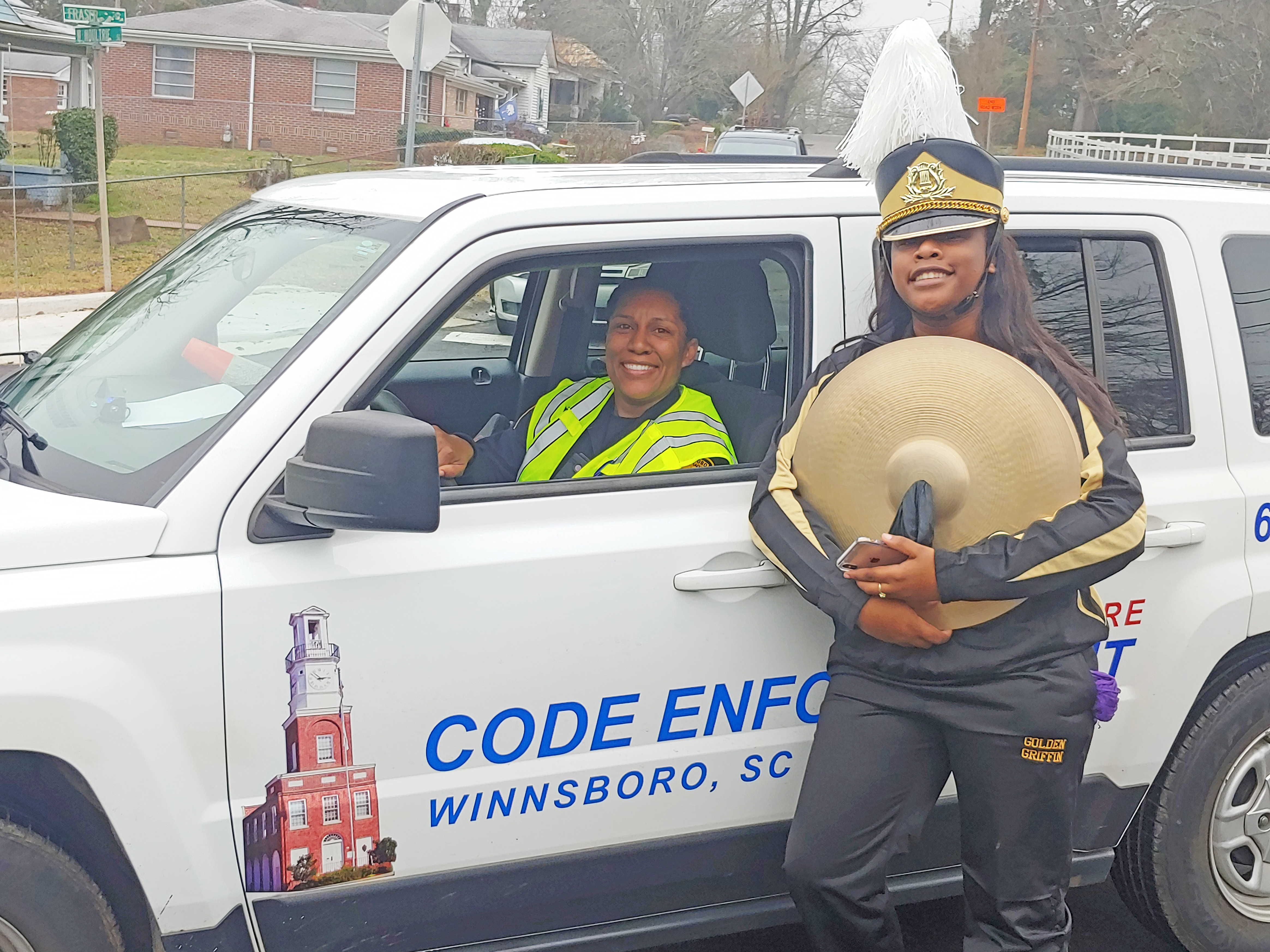 WINNSBORO – Deemhyia English, right, and Sgt. Francine Goins prepare for the 3rd annual Martin Luther King Day Parade in downtown Winnsboro on Saturday. The parade was sponsored by Believers and Achievers. There were 15 entries in spite of a forecast of rain, which only amounted to a drizzle.