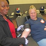 WINNSBORO – Red Cross phlebotomist Mickey Grant, left, assists Leigh Gambrell during the Boots and Badges blood donation competition Saturday at the Winnsboro Church of the Nazarene. The Sheriff’s Department slid past the Fairfield County Fire Department to take the win in the friendly competition.