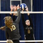 WINNSBORO – Richard Winn Volleyball dropped a region match to Wardlaw Academy last Thursday 0-3. The Eagles faced Great Falls on Wednesday, but scores were not available at press time. They head to Greenwood for a region match against Cambridge tonight. Pictured above, Delaney Young (8) blocks a Wardlaw attack.