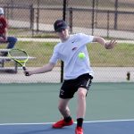 BLYTHEWOOD – Steven Massey sets hit feet and prepares to launch a return shot. Massey lost in a tough three set matchup to York’s Blake Williams. The Cougars swept the Redhawks 6-0, and also bested them in doubles competition.